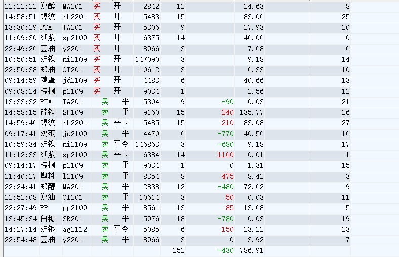 坚持了只做多不做空。今天做的有几个问题:1.郑醇鸡蛋和镍,在没有形成突破的时候主观认为会突破,进去后止损。2.白糖,刚一突破就回踩,导致连连止损,本来很好的上涨行情,在白糖上亏大了。 纸浆上做多我坚持了,拿了一笔利润,不过止盈没做好,最后两根上涨大K线错过,有待改进。3.2点半的时候进了硅铁做多,赚了6个点跑了后进螺纹,不出5分钟硅铁大涨30点,螺纹却跌跌不休。两粕涨的那么好也没敢进。回顾自己这么久的交易,各种各样的坏毛病层出不穷,很多我自己没意识到的都展现的淋漓尽致,我不仅卑微,简直卑微到尘土里去了。有时候做完交易看看镜子里的这个人,有着怎么样的性格,真是沮丧到极点,恨铁不成钢。每天都错过多少好机会,又乱做了多少次。现在只多不空可能还减少了乱做的次数。