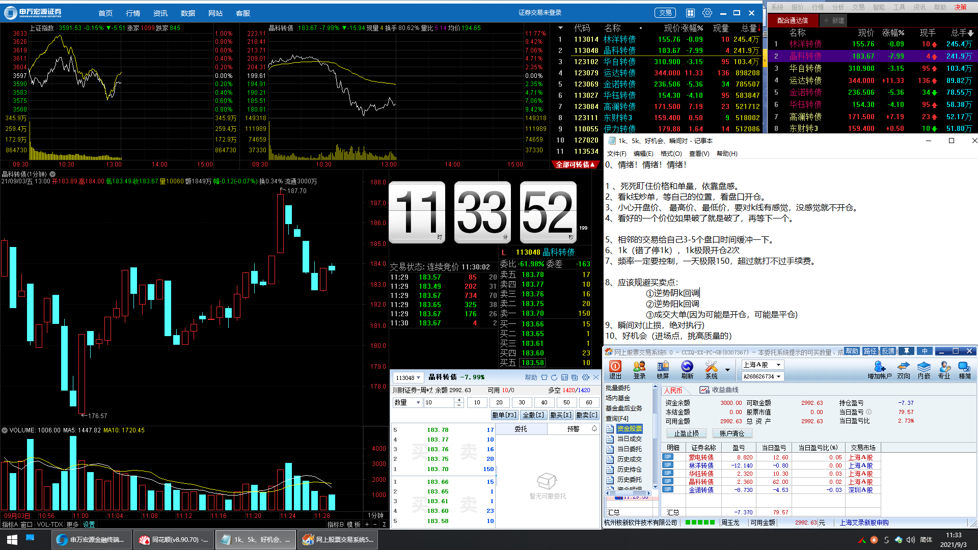可转债不同于期货,就是这么现实的品种,成交量在哪里就只能到哪里做。每个债的波动还不一样,我记得6-7月的时候做追涨比较轻松,现在追涨都不太敢追了,比如金诺银河华自这种,追就给你套一下,拿一会就是扛单了,砍出来又是大点,它又回去了,看着价格往下跌。冷不丁的蹿出个大单,把价格拉上去,对价开不进去,开进去就套你。搞的我现在做回调的次数越来越多,蹭点越来越多。