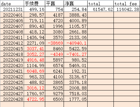 十日十月 发表于 2022-5-1 12:39 四月份算上FH没赚没亏 月中大亏之后只做螺纹,还有些不好的单子,争取把这些垃圾单减少再减少,那道砍儿就 ...