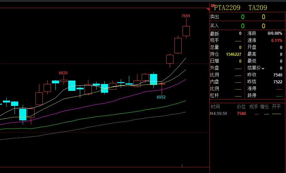 碰到这种情况,我也只能和他说,振荡市可以这么搞。但以PTA目前这种单边上涨情况,用摊平成本的方法来做,非常危险。