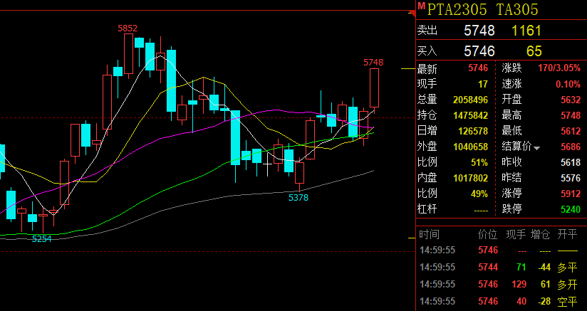 在区间震荡近一个月时间后,这个交易日PTA期货主力合约终于站上区间高点5722元,收于5746元,最终涨幅达到3.05%。